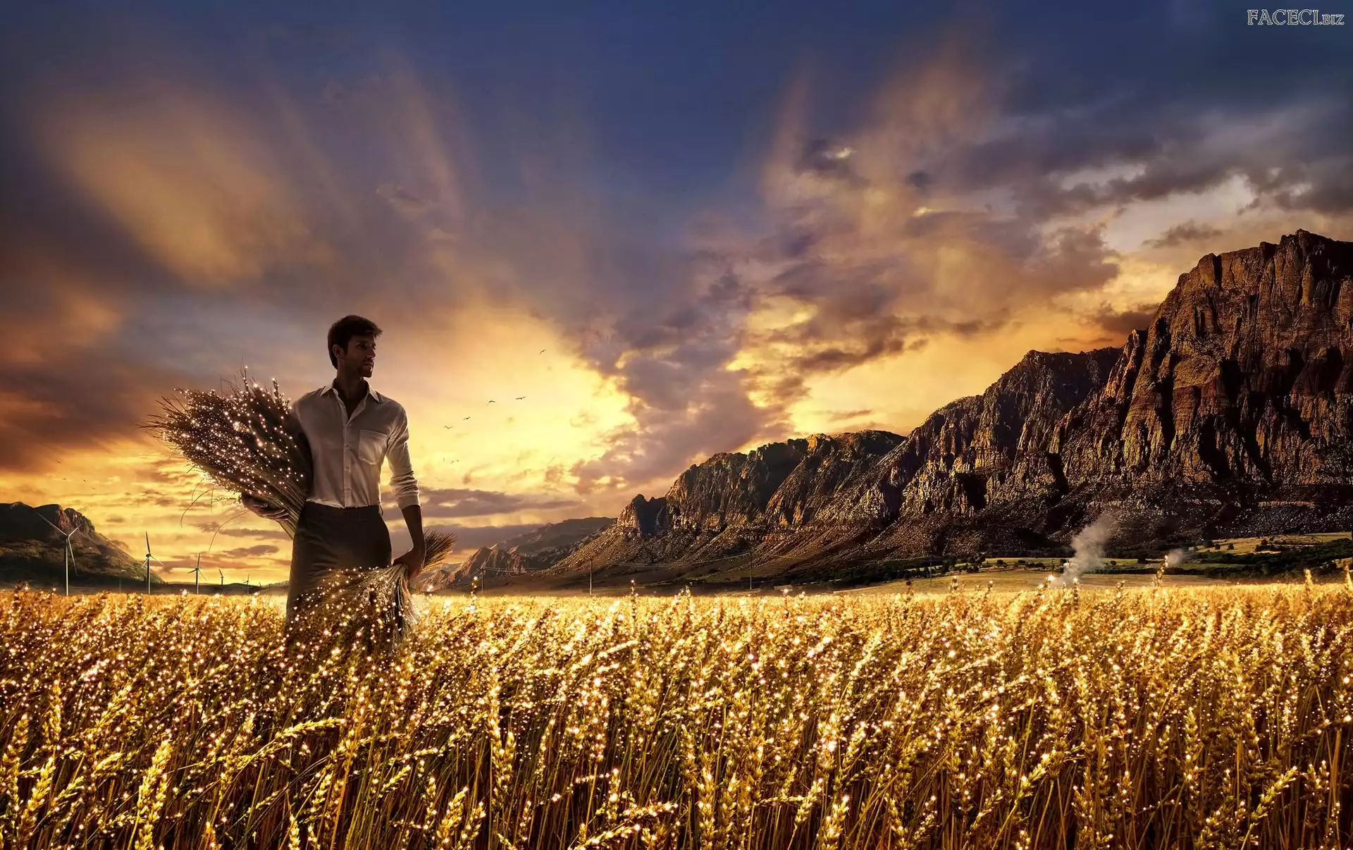 Mężczyzna, Zboża, Słońca, Zachód, Skały - faceci.biz